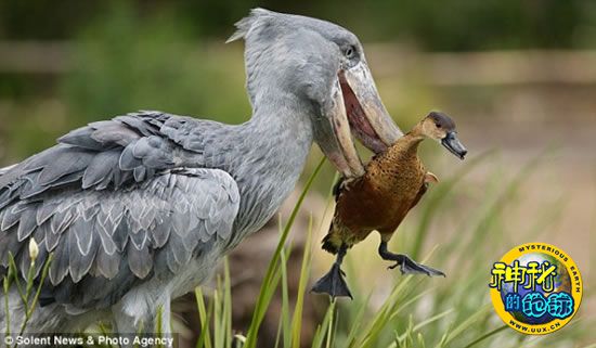 美国一名业余摄影爱好者拍到了大鲸头鹳叼起拦路的野鸭,将其放在一边的有趣画面。