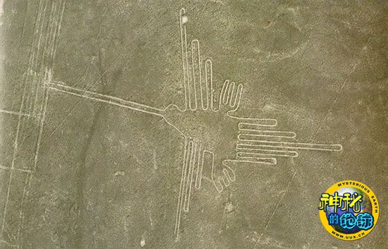 此外还有一幅名字叫鸟图的图画,在纳斯卡荒原上共砌着18个这种鸟图。这种鸟图尺寸非常巨大,长30~40米不等。同时,在纳斯卡出土的部分陶器上也发现有类似的鸟。