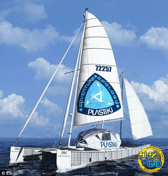 这艘帆船由回收的塑料制成,内嵌1.25万个充满CO2的塑料瓶