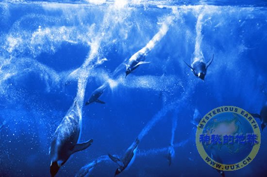 Streams of bubbles trail behind emperor penguins diving off Cape Washington in Antarctica.