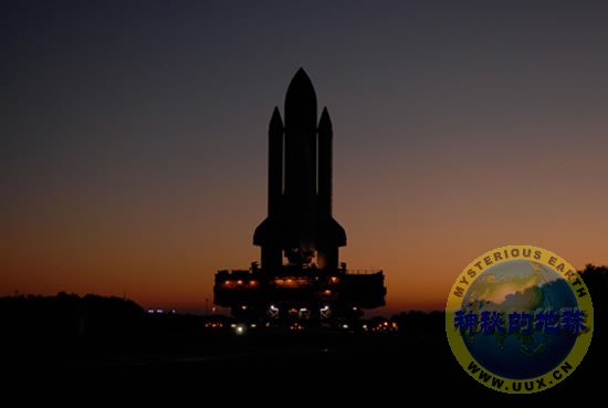 A silhouette against the rising sun Thursday, December 6, 2007, space shuttle Atlantis rode a crawler-transporter to the launch pad before liftoff was postponed due to incorrect fuel gauge readings.