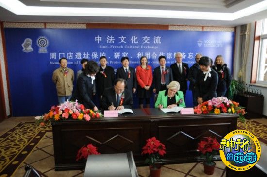 2009年12月3日上午,“中法文化交流——周口店遗址保护、管理、利用合作谅解备忘录签字仪式”在周口店遗址举行。此次中法文化交流是周口店遗址纪念“北京人”第一颗头盖骨发现80周年系列活动之一。房山区人民政府副区长卢国懿主持签字仪式。法国遗产行业基金会副主席兼秘书长贝阿特丽丝女士与周口店遗址博物馆馆长杨海峰签署“中法文化交流——周口店遗址保护、管理、利用合作谅解备忘录”。联合国教科文组织世界遗产中心亚太部项目主任景峰、国家文物局文化遗产处处长唐伟、法国史前国家博物馆馆长让.雅克.克莱亚特—梅尔、法国企业管理学院副院长奥利维尔.伊萨贝尔、法国遗产行业基金会项目经理玛丽—安德丽 克斯托尔、中国科学院古脊椎动物与古人类研究所研究员董为、周口店遗址博物馆副馆长董翠平及相关人员参加签字仪式。合作谅解备忘录内容包括:开展馆际交流与合作、联合拍摄纪录片、遗产地管理人员培训和继续发挥遗产行业基金会的作用,为周口店遗址地点保护募集资金四项内容。