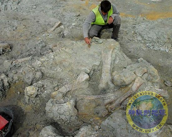 A scientist excavates the fossilized skeleton of a titanosaur in eastern Spain. A huge "graveyard" of some 8,000 fossils found there is the largest and most diverse cache of dino-era remains ever found in Europe, experts say.