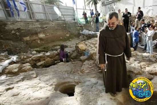 牧师伊卡拉姆行走在发掘现场之上。考古学家亚历克斯安德烈表示,一面墙壁、一个藏身处以及一个蓄水池的遗迹是建筑工人在以色列北部城市拿撒勒挖掘一个老修道院庭院时发现的。