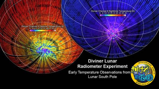 这张图展示了月球上白天和黑夜的开尔文温度,该图是美国宇航局月球勘测轨道飞行器上的“占卜者”(Diviner)观测设备在2009年9月17日拍到的一些新图片中的一张。