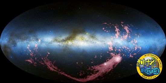 在这张来自罗伯特-拜尔德绿岸射电望远镜的照片中,两个麦哲伦星云(图像右下角白点)释放出大量的氢气(红色),这些氢气在银河系下方(蓝白相 间部分)形成一道弧线。最新照片显示,所谓的麦哲伦流(Magellanic Stream)比之前天文学家估计长了40%左右,表明这种现象可能源于25亿年前。美国弗吉尼亚大学天文学家戴维-尼德威尔(David Nidever)在一份声明中称,那个时候,两个麦哲伦星云“可能已经相互靠近,拉开了恒星大规模形成浪潮的序幕。”据他介绍,这些活动可能引发了恒星风 和大爆炸,使得第一批麦哲伦流向银河系方向进发。