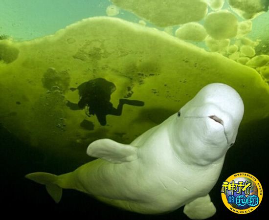 在俄罗斯白海北极圈潜水中心,一头白鲸正看着几英尺远的一名冰下潜水员。