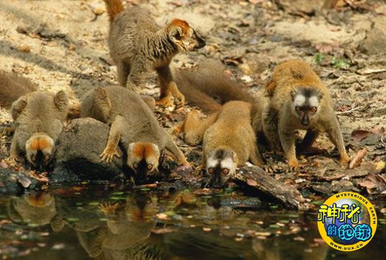 在马达加斯加拍到的一群正在池塘边喝水的红额狐猴