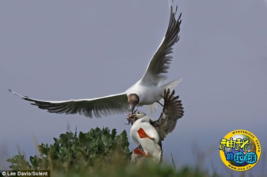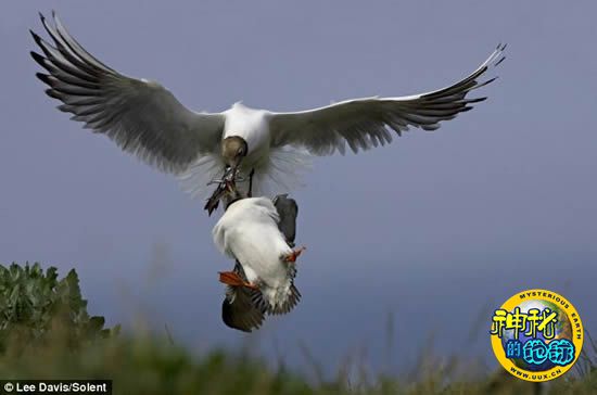 海鸥空中夺食的照片是曾经获奖的业余摄影师李·戴维斯拍摄的,当时他正在诺森伯兰郡法尔恩群岛上拍摄海雀。这种大嘴海鸟身高可达到1英尺(约合30.48厘米),它们在法尔恩群岛上筑巢,主要以各种小鱼为食。海雀一次能够捕获大量小鱼并因此著称海鸟世界,但也正是这一出色的捕食能力,照片中的那只海雀才沦为海鸥的抢劫目标。