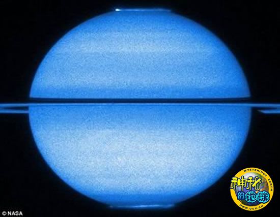 土星环绕太阳旋转一周为30年,在公转一次中仅出现两次土星双极光现象。哈勃望远镜拍摄的这张图像显示土星每个极地同时出现闪亮的极光。这一现象是由于“太阳风”形成的,太阳风是太阳喷射的亚原子带电粒子流,与土星大气层的分子发生交互作用。