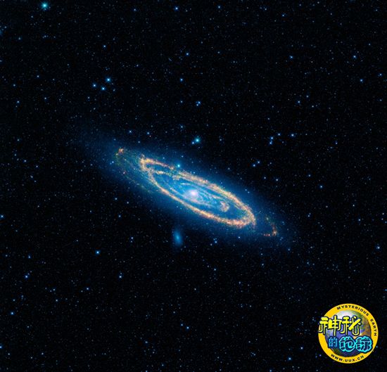 2009年12月,美国航空航天局(NASA)的大视场红外巡天探测者(Wide-fieldInfrared Survey Explorer,WISE)发射升空,任务是在红外波段巡视整个天空。该探测器已在地球附近发现了一颗新的小行星和一颗新彗星。2010年2月17日,NASA公布了WISE拍摄的一系列已知天体的照片。在这张仙女座星系的红外图片中,蓝色光代表了恒星,它们发出了大量的热,红色光则标示出了比较寒冷的区域,比如该星系里的尘埃带。星系盘下方的蓝色光团是M 110,这个椭圆星系是仙女座星系的众多卫星星系之一。