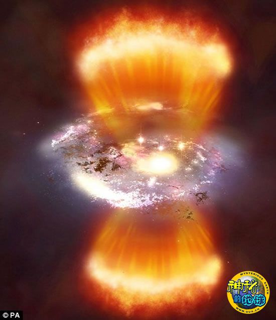 这张图片展示的是科学家绘制出的大型星系黑洞中碎片外流时的场景。科学家认为星系内部黑洞中流出的碎片,或者超新星产生的强风是导致大型星系发生‘星系爆炸’的主要原因