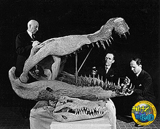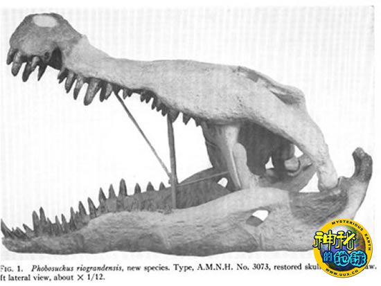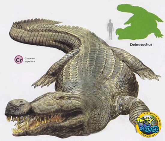 这是根据恐鳄化石复原的恐鳄图片,可以看到它与现代人类和现代鳄鱼的对比