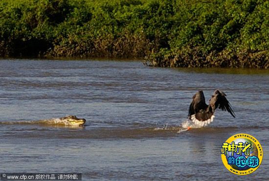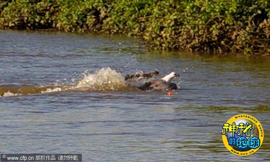 老鹰冲进水中捕鱼被鳄鱼猎杀 来源: 神秘的地球 时间:2010年4月09日 15:38 河面上不时有老鹰冲入水中捕鱼 一只老鹰捕鱼时,身后一只鳄鱼悄悄接近老鹰。 鳄鱼捕食老鹰 2010年4月8日消息,一位在澳大利亚阿德莱德河边钓鱼的男士日前目睹了动物界的残酷——一只鹰在冲进河水中捕鱼时被鳄鱼捕杀。虽然这两种动物几乎都处于自然界食物链的顶端,但当一条3米长的鳄鱼盯上了一只眼中只有食物的鹰时,它显然更有优势。鳄鱼在鹰触及水面的一瞬间咬住它往水里拖,只花几秒钟的时间就把鹰给杀死了。 China Foto Press 上一篇 下一篇 TAG: 捕鱼 鳄鱼 老鹰 猎杀