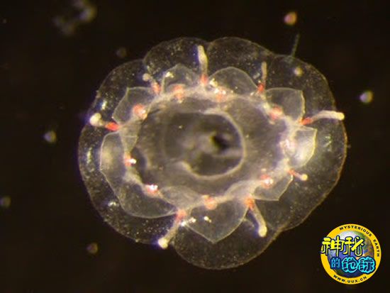 把生殖器露在体外的新类水母呈飞碟状,顶部环绕着一群生殖器。