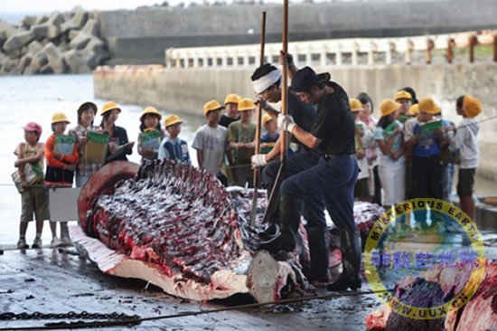 School children on a field trip watch and take notes as a Baird's Beaked whale is butchered in Wada, Japan on June 21, 2007.