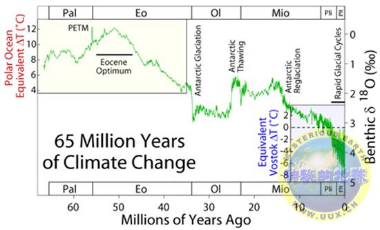 A chart of temperature data for the past 65 milion years shows the sudden and brief spike known as the Paleocene-Eocene thermal maximum (PETM).