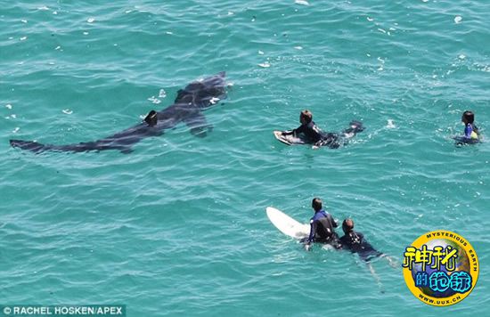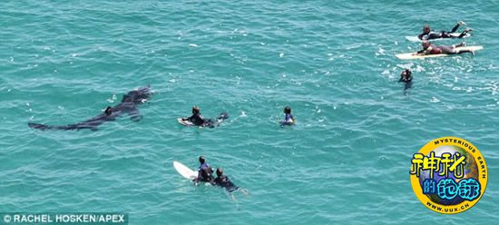 好奇的冲浪爱好者围绕在姥鲨四周,此时他们距离海岸只有几码远。