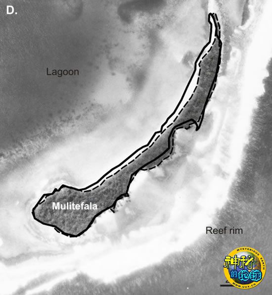 卫星图片展示出惊人的结果:南太平洋小岛并没有因为海平面上升而缩小。实线表示的是今天的海岸线,虚线表示的是1984年的海岸线位置。