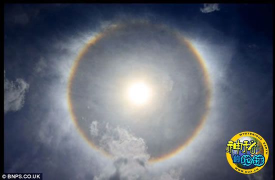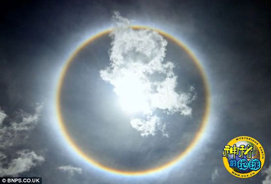 这就是7月20日出现在伯恩茅斯沙滩上空的美奂绝伦的一幕。其实出现的这种神秘光晕叫做“幻日”,这种现象是由天空中规则的六角形冰晶体折射阳光造成的,而幻日的发生是比较普遍的,我们一般都称之为“光晕”或者是“光环”。