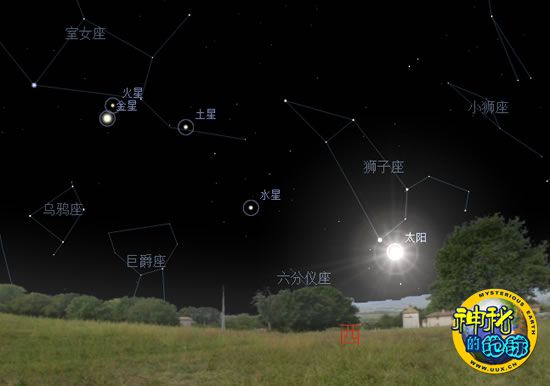 虽说金星地平高度有所降低,但我们找到金星并不困难。因为金星接近大距,大的亮度也在逐渐增加,20日傍晚,西方天空中-4.4等的金星将非常明显。而同时我们还可以在其不到2°的位置找到火星,当然还有右侧10°左右的土星,以及差不多远的角宿一。总体来说,金星大距并不一定是观测条件最好的时候,但其相位正好为50%,如果你通过望远镜观察它的话,会看到类似上弦月的情景。