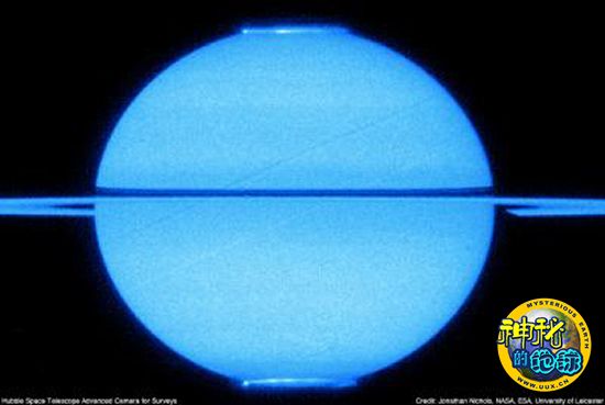 在这张采用哈勃空间望远镜先进巡天相机拍摄的照片上,土星两极都可以见到极光,拍摄时间是2009年 图像版权:Jonathan Nichols, NASA, ESA, University of Leicester