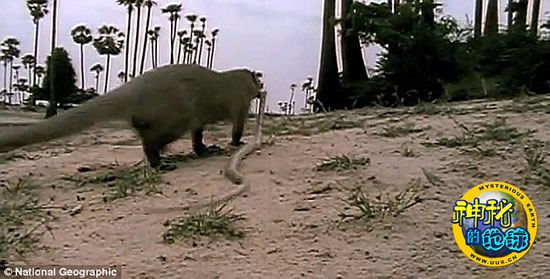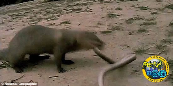 猫鼬看准时机将眼镜蛇抛向空中,并狠狠咬住了蛇头。