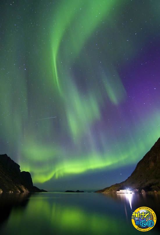 一位挪威摄影师的镜头成功捕捉到一处湖面上空的北极光景观。天空呈现出梦幻般的紫色,伴随着碧绿的光纹,倒映在湖水里,仿佛童话中出现的景色。