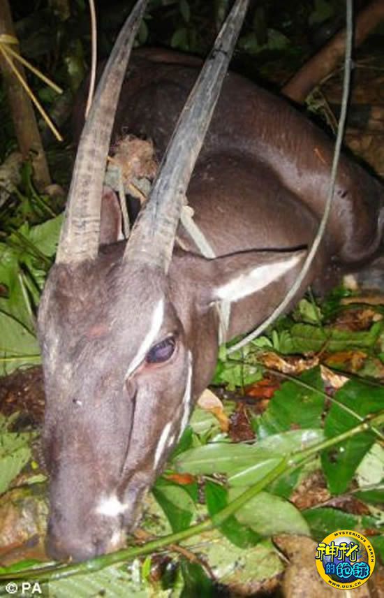据环保人士称,十分不幸的是这只武广牛被老挝当地村民圈养几天后因身体虚弱而死。武广牛主要生活在越南和老挝的山脉地区,首次发现于1992年。它非常类似于北非羚羊,但却野牛亲缘关系最近。它的头部长着两个突起的长角,常被人们称为“亚洲麒麟”。