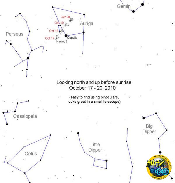 据悉,17日和20日之间,在天亮之前朝北观望,穿过御夫座便可以看见一个幽灵般的绿光一闪而过。此图为10月17日-20日之间的天象位置图
