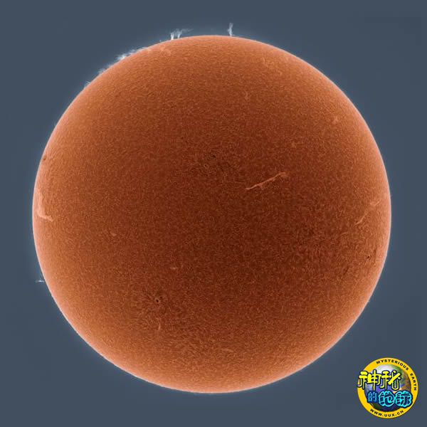 这张壮观的照片不是由太阳及日球层天文台(SOHO)、太阳动力学观测台(SDO)这些造价高昂的望远镜拍摄的,而是弗里德曼用相对小的望远镜捕捉的。在照片中,你可以清楚地看到太阳黑子、巨大的对流圈、尾随穿透太阳表面的磁环活动的气体。当它们在太阳盘面的背景下出现时,科学家称之为“暗条”;当它们以弧形在太阳盘面边缘的背景天空中出现时,我们称之为“日珥”。