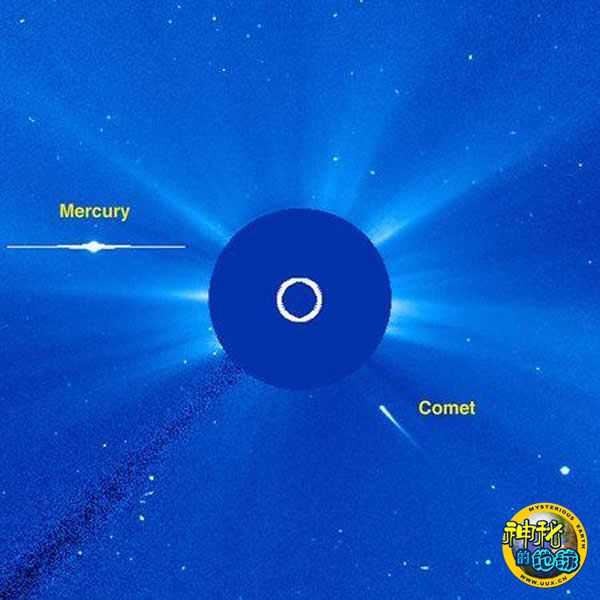 美宇航局太阳和太阳风层探测器(SOHO)在用于阻滞阳光的挡板(图中)帮助下,可能保持着拍到最多“彗星自杀”的记录。SOHO探测器装备有 用以发现更小、更暗彗星的独特设备,比如这个克鲁兹族彗星(照片右下)的潜在成员,被认为是至少2000年前一颗巨大彗星分裂后产生的碎片。这颗小彗星在10月19日 至21日可以看见,很显然是在靠近太阳时崩溃的。
