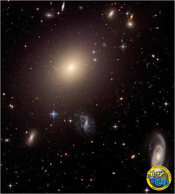 这是哈勃空间望远镜摄于2006年的影像。显示的是一个包含了各种星系的星系团,其中就有一个明亮的椭圆星系