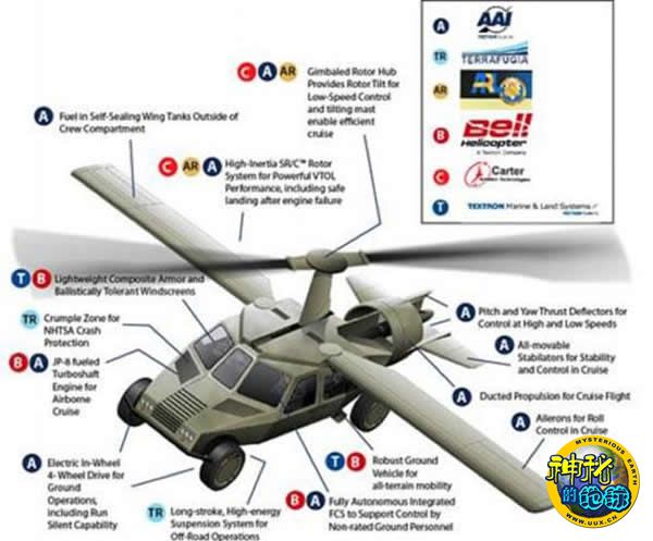 该车安有自动飞行控制系统,因此没有飞行员资格的人也能驾驶它,这增强了它的灵活性。除此以外,它还配备机枪和火炮,能够杀死或重创武装分子。这种体长20英尺(6.10米)的飞车,在陆地上的行驶速度大约可达每小时65英里(104.61公里),在空中的飞行速度超过每小时150英里(241.40公里)。被称作“变形金刚(Transformer)”的这种飞车的原型机,将在2015年完成研制,届时英国和美国部队可能仍驻守在阿富汗。