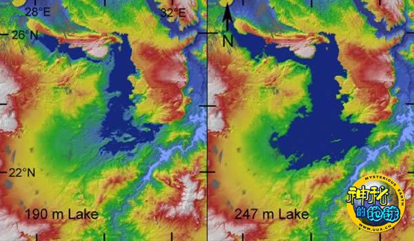 在它最大的时候,图什卡湖的占地面积超过6.8万平方公里(如左面的伪彩色地形图所示)。在其他时间(如右图所示),尼罗河(位于两张图的右侧)流入这个低洼盆地的水更少,这导致该湖的面积缩小。红色区域代表的是高出盆地底部大约400米的高地。