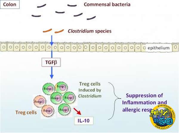 小鼠结肠的梭菌属细菌种刺激肠上皮细胞分泌 TGF-b,造成Foxp3表达的T细胞的累积以及IL -10在结肠的产生,这有助于抑制炎症和过敏性反应。