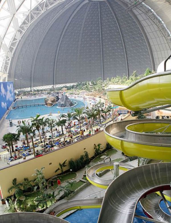 而最令人感到兴奋的是,座落于德国乡村的热带群岛建在一个重新改造的巨型飞艇棚内。飞艇棚的体积达到惊人的1.94亿立方英尺(约合5493468立方米),是世界上体积最大的建筑之一,最初由CargoLifter AG公司建造,用于停放一款原型飞艇。CargoLifter AG于2002年破产,将这座351英尺(约合106米)高的飞艇棚卖给了马来西亚公司Tanjong。在这家公司手上,飞行棚被改造成一个海滨度假村,建有水上公园和世界上最大的室内游泳池。