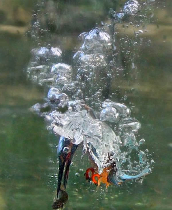 诺埃尔先将一条鲦鱼放入大鱼缸,然后将鱼缸几乎完全沉入水中,旁边再竖起一根长长的树枝。在接下来的几个月里,翠鸟逐渐适应了从鱼缸中捕食午餐。诺埃尔一点点地将鱼缸挪到距离河水更远的地方,以便能拍摄更为清晰的照片。最终,当翠鸟再以迅雷不及掩耳之势潜入鱼缸捕食时,他就可以捕捉到这个瞬间。