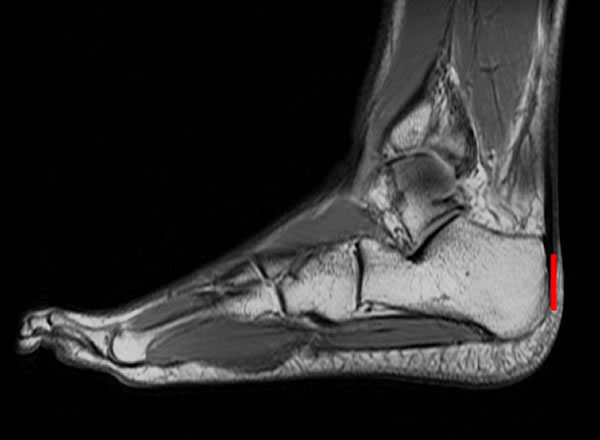 长跑运动员的脚部核磁共振图,跟骨与跟腱紧密连接,测量跟骨的长度(红线)有助于研究者确定长跑能力。