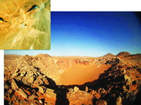 在埃及发现的45米宽的卡米尔陨石坑(小图为鸟瞰图)提供了证据,表明小型铁陨石有可能完好无损地到达地球表面。