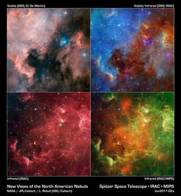 这张最新斯皮策望远镜图像显示恒星形成的所有阶段,从覆盖灰尘的婴儿时期至成年早期,同时,恒星还是新的“亲源”可形成多个行星。尽管该照片展现出这个正处于发育的恒星家族的新特征,但北美星云仍存在诸多谜团。目前,该星云中占据控制地位的超大质量恒星群尚未观测到,斯皮策望远镜图像和其它望远镜图像暗示这些未发现的恒星可能潜伏在该星云的“墨西哥湾”区域。