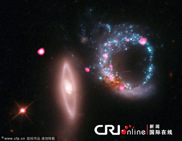 (神秘的地球www.uux.cn)这幅新合成的图片来自于美国宇航局的两架望远镜,展现了一个由新形成的恒星构成的环,上面装点着粉红色的黑洞。黑洞在其中一个星系的周围地区形成。