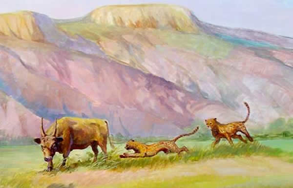 临夏西瓦猎豹袭击短角丽牛(李荣山绘)