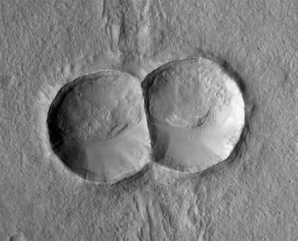 这张图片显示,两个对称的重叠陨石坑一定是在同一时间形成
