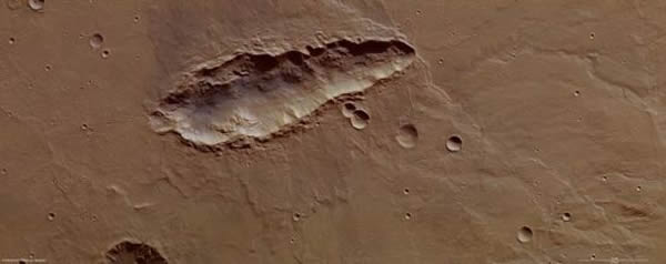 在这两幅图中,其中一幅图鼻涕虫形状的陨石坑是欧洲航天局的“火星快车”在2010年8月4日拍摄到的,它可能是由一系列与火星表面夹角较小的陨石俯冲而下形成的。这个48英里(77.25公里)长的陨石坑目前还未命名,它位于布满陨石坑的火星南部高地,仅比更大的陨石坑惠更斯(Huygens)盆地更靠南一些。