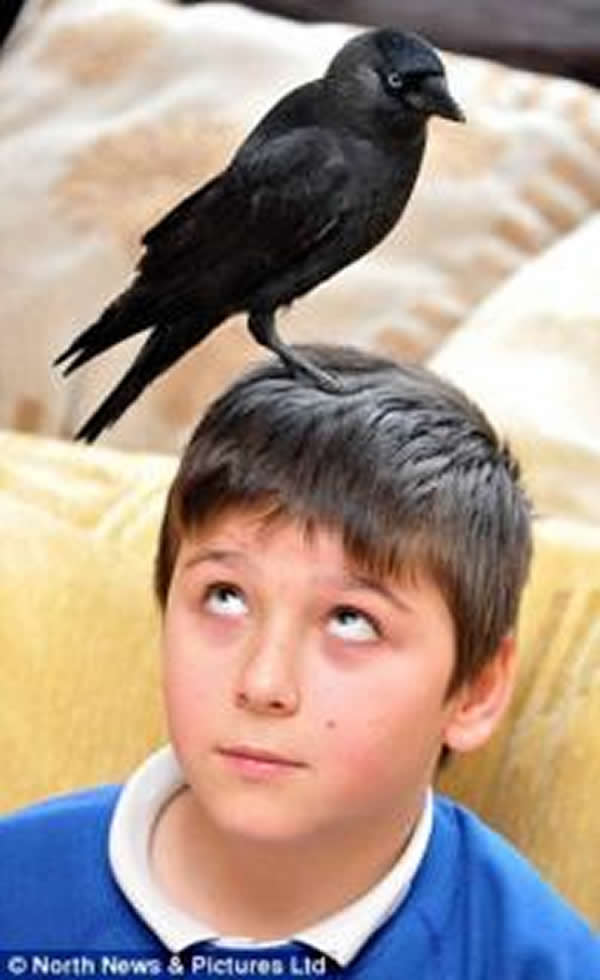 寒鸦站在英国小学生埃曼纽尔•亚当(Emmanuel Adams)的头上