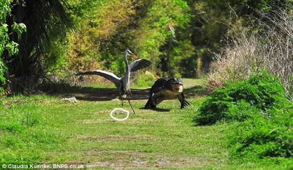 鳄鱼妈妈紧追不舍,直到惊恐万分的苍鹭丢下小鳄鱼狼狈逃走。