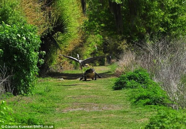 在美国佛罗里达州波克县(Polk County)的一个自然保护区,46岁的摄影师克劳迪·昆克尔(Claudia Kuenkel)记录下了自然界罕见的一幕。一只苍鹭显然已经饿疯了,它竟然从一个鳄鱼巢里叼起了一条小短吻鳄。