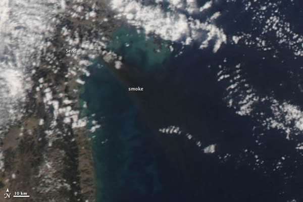 “由于烟雾缭绕,MODIS设备很难分辨出仙台市内的具体着火地区,但我们观测到的这种黑烟一般而言确实是由油料或气体燃烧产生的。”霍利·里贝克(Holli Riebeek)写道。他是美国宇航局戈达德空间飞行中心的科学家。根据新闻报道,仙台地区确实有一座炼油厂在地震后发生了起火燃烧。