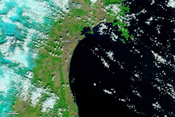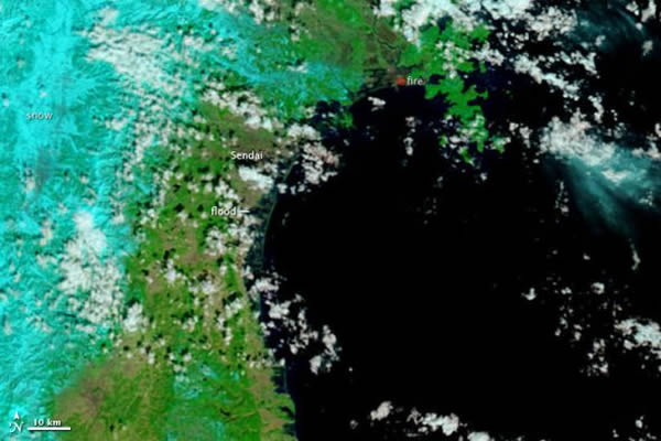 宇航局下属的对地观测卫星“大地”(Terra)和“海洋”(Aqua)从太空俯视9.0级地震之后的满目疮痍。它们拍摄的图像显示,日本东北地区,尤其是仙台市附近,已经发生了严重的洪灾,并且大火蔓延。